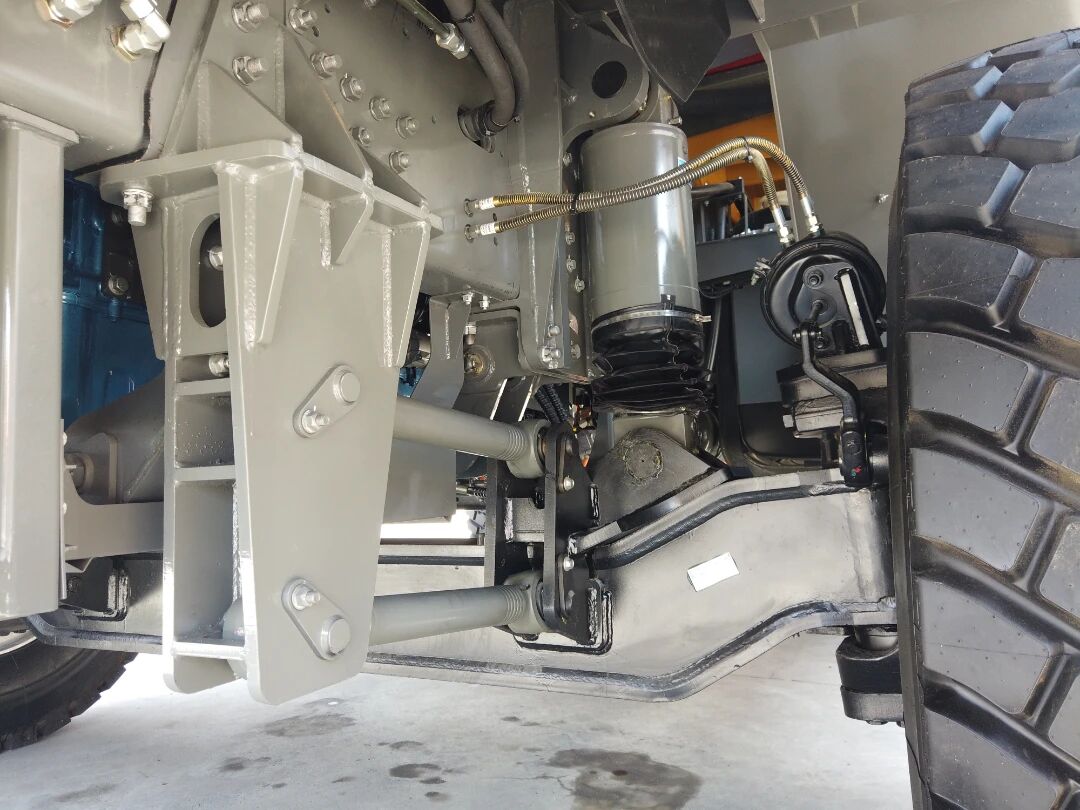 前懸架采用五連桿-非獨立式油氣懸架,200/170-230大缸徑油缸,大大提高前懸架的承載能力,顯著降低板簧故障率,提高可靠性。